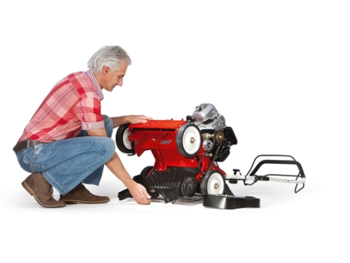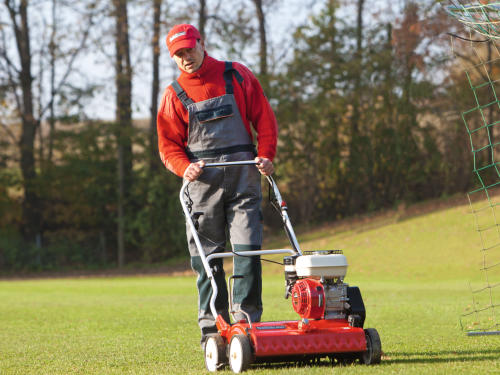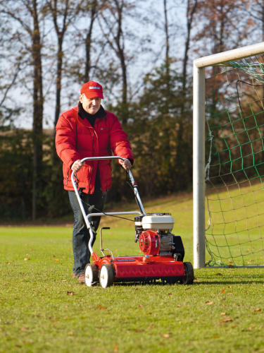 Feuchte Moos- und Rasenfilzreste bleiben ständig an den Rädern haften. Der Vertikutierer ist mit einem Profilreiniger ausgestattet, mit dem feuchte Moos- und Rasenfilzreste laufend entfernt werden. Die eingestellte Arbeitstiefe bleibt dadurch konstant, das Arbeitsergebnis gleichbleibend gut. Zusätzlich ist der Vertikutierer mit einem stabilen Prallschutz ausgestattet, damit keine Steine oder andere harte Gegenstände ungebremst herausgeschleudert werden.